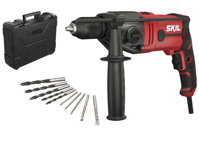 De SKIL 6745 klopboormachine met zeer krachtige 1050W motor is niet alleen ideaal voor het boren in bakstenen en metselwerk, maar ook voor het boren in hout, metaal, keramiek en kunststof. Hij heeft twee snelheden, één voor snel boren en één voor zware boor- en schroefklussen. Het hamermechanisme is voor het boren in metselwerk en de hamermodus kan worden uitgeschakeld voor gewoon boren en schroeven. Dit gereedschap is voorzien van een metalen 13 mm-snelspanboorkop met enkele bus en vergrendeling die voorkomt dat de bits kunnen slippen. Dankzij de automatische asvergrendeling kunnen accessoires gemakkelijk worden gewisseld. De variabele-snelheidsschakelaar met vooraf instelbare snelheid biedt veelzijdigheid en controle over uw klus voor de beste resultaten. Voor uw gemak kunt u de schakelaar vergrendelen voor continu boren en schroeven. Deze klopboormachine heeft een groot aantal praktische functies, bijvoorbeeld de functie voor links-/rechtsdraaien. Deze is bijvoorbeeld handig bij het losdraaien of verwijderen van schroeven. Bovendien zorgt het ergonomische ontwerp met softgrip voor extra gebruikscomfort. De SKIL 6745 GA wordt geleverd in een compacte draagkoffer, inclusief een set van 5 bits voor het boren in hout, 5 bits voor het boren in metselwerk, een zijhandgreep en een diepteaanslag.