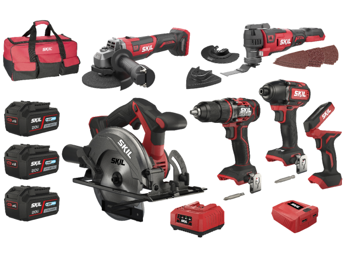 Das Combi-Set SKIL 3351 „20V Max“ (18 V) besteht aus sieben leistungsstarken Werkzeugen, mit denen Sie praktisch jede Arbeit bewältigen. Der bürstenlose Akku-Bohrschrauber SKIL 3060 erfüllt alle Ansprüche bei schwierigen Schraubaufgaben und beim Bohren in Holz und Metall. Der bürstenlose Akku-Drehschlagschrauber SKIL 3230 bietet ein hohes Drehmoment für müheloses Ein- und Ausdrehen großer Schrauben und Bolzen. Das bürstenlose Akku-Multifunktionswerkzeug SKIL 3650 eignet sich für ein breites Spektrum von Arbeiten wie Schleifen, Sägen und Trennen. Die bürstenlose Akku-Kreissäge SKIL 3550 ist ideal für präzises Sägen. Der bürstenlose Akku-Winkelschleifer SKIL 3930 eignet sich zum einfachen und effizienten Schleifen und Trennen. Die Akku-LED-Arbeitsleuchte SKIL 3155 sorgt überall dort für Helligkeit, wo Sie Ihre Heimwerkerarbeiten erledigen. Nicht zuletzt bietet der USB-Akkuladeadapter SKIL 3152 eine Ladelösung für Ihre elektronischen Geräte. Die Lithium-Ionen-Technologie kennt keinen Memory-Effekt und keine Selbstentladung und stellt sicher, dass die Werkzeuge immer einsatzbereit sind. Das Combi-Set SKIL 3351 EA besteht aus einer großen Transporttasche, sieben Werkzeugen mit Zubehör, drei Akkus „20V Max“ (18 V) 4,0 Ah „Keep Cool™“ und einem Schnellladegerät.