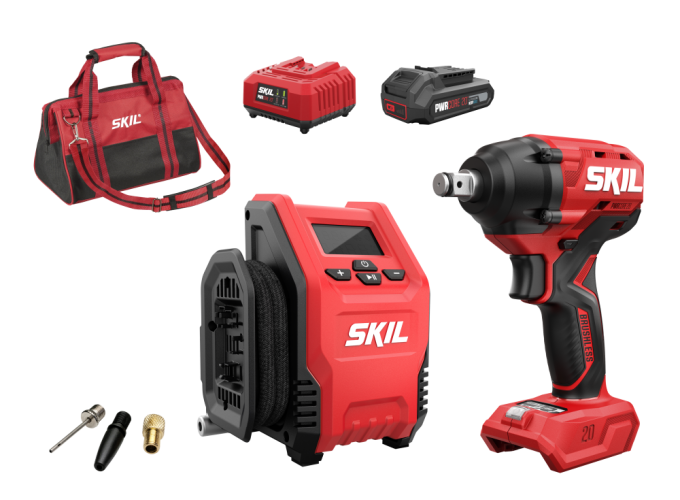 Das Combo-Set SKIL 3360 DA umfasst den bürstenlosen Akku-Drehschlagschrauber SKIL 3241 und den Akku-Kompressor SKIL 3159. Wie alle anderen „20V Max“-Akku-Werkzeuge von SKIL besitzen auch diese Modelle den branchenführenden „PWRCORE 20™“-Akku mit innovativer Ladetechnologie. Der SKIL 3241 ist ein Hochleistungs-Drehschlagschrauber, ideal zum Ein- und Ausdrehen von Schrauben und Muttern. Das Werkzeug erledigt mit seinem hohem Anziehmoment von 300 Nm und einem Losbrechmoment von 500 Nm mühelos anstehende Arbeiten. Er ist Teil der bürstenlosen Serie von SKIL und bietet ein einzigartiges Preis-Leistungsverhältnis. Im Durchschnitt liefern diese Werkzeuge beeindruckende 45 Prozent mehr Leistung und erledigen Arbeiten 55 Prozent schneller als Werkzeuge mit einem konventionellen Bürstenmotor. Ebenso wichtig: Bürstenlose SKIL-Motoren halten 10 Mal länger als konventionelle Motoren, was sie zu einer kostensparenden und nachhaltigen Wahl macht. Der SKIL 3159 ist ein Akku-Hochdruckkompressor, der ideal zum Aufpumpen von Autoreifen, Fahrradreifen und Sportbällen ist. Das LCD-Display zeigt den Druckmesser und den Solldruck deutlich an. Der Solldruck kann mit den Tasten eingestellt werden und das Werkzeug schaltet sich automatisch ab, wenn der erforderliche Druck erreicht ist. Das Combo-Set SKIL 3360 DA umfasst beide Werkzeuge. Geliefert wird es in einer Tragetasche mit einem 2,0 Ah „KEEPCOOL™“-Akku, einem Schnellladegerät, einem dreiteiligen ½”-Steckschlüsselsatz, einem Presta-Ventiladapter, einem Dunlop-Ventiladapter und einer Sportballnadel.