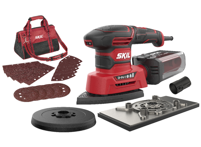 Der SKIL 7280 ist ein leistungsstarker Multischleifer zum schonenden Schleifen von Oberflächen aller Art. Er kombiniert drei verschiedene Schleifgeräte in einem Gerät: Schwingschleifer zum Schleifen größerer Oberflächen, Exzenterschleifer zum Schleifen gekrümmter Oberflächen bei höchster Abtragsleistung und Deltaschleifer für Ecken und Kanten. Das Wechsel der Fußplatten geschieht sehr einfach mittels 1-Schrauben-System. Und mit der Drehzahlregelfunktion lässt sich die Drehzahl auf die jeweilige Arbeit abstimmen. Optimale Leistung und Haltbarkeit sind sichergestellt, dank des leistungsstarken 250-Watt-Motors und einzigartigen LED-Leuchte „Overload Alarm“. Dieses Werkzeug besitzt das patentierte Staubauffangsystem „X-Flow“, das den Staub ohne Filter aus der Luft abscheidet. Der Hauptvorteil: Es gibt keinen Filter, der verstopfen kann, was bedeutet, dass die Staubabsaugung über lange Zeit hervorragend arbeitet. Das ermöglicht sauberes Arbeiten. Der SKIL 7280 DA wird in einer Transporttasche mit 15 Klettschleifblättern, runder, quadratischer und spitzer Fußplatte, einer drehbaren Delta-Spitze, einem „X-Flow“-Staubauffangbehälter und einem Staubsaugeradapter geliefert.