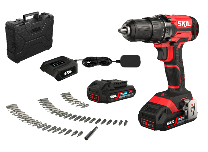 El taladro/atornillador a batería SKIL 3008 de «20V Max» (18V) es apto para todas las tareas de bricolaje más exigentes de atornillado así como las de taladrado en madera o metal. Tiene dos velocidades que se pueden utilizar tanto para taladrar con rapidez como para atornillar trabajos extremos. Cuenta con 17+1 ajustes de par de apriete para proporcionar resultados precisos con sus 17 opciones de atornillado y otro ajuste adicional para trabajos de taladrado. Puede cambiar los accesorios de manera rápida y sencilla gracias al portabrocas de cierre rápido automático de 13mm. El bloqueo del eje automático permite cambiar los accesorios de forma fácil. En definitiva, esta versátil herramienta le ofrece todo lo que necesita: tecnología fiable de batería de litio, velocidad variable para tener un control total y luz LED para trabajar con la visibilidad adecuada. Además, esta herramienta dispone de un práctico indicador LED de avance/retroceso, para poder ver de inmediato en que sentido está trabajando. Por último, pero no menos importante, el diseño ergonómico y la empuñadura suave de la herramienta ofrecen un extraordinario confort durante el trabajo. El indicador de nivel de la batería patentado muestra de forma práctica el nivel de carga restante en la batería. El SKIL 3008 HA se suministra en un robusto maletín de transporte con dos baterías «20V Max» (18V) «Keep Cool™» de 2,0Ah, un cargador, un juego de 50 accesorios para atornillar, un portapuntas magnético y un clip de cinturón.