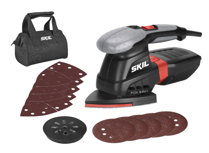 Το πολυτριβείο 3-σε-1 «Fox» SKIL 7220, συνδυάζει έναν ισχυρό κινητήρα 250 W με μια παλμική και έκκεντρη κίνηση, ανάλογα με τον επιλεγμένο δίσκο στήριξης. Με το στρογγυλό δίσκο στήριξης, το πολυτριβείο εκτελεί μια έκκεντρη κίνηση, έτσι είναι το ιδανικό τριβείο για τη γρήγορη αφαίρεση υλικού σε μεγάλες επιφάνειες και για τη λείανση καμπυλωτών επιφανειών. Με το δίσκο στήριξης με βάση σε σχήμα σίδερου σιδερώματος το τριβείο εκτελεί μια παλμική κίνηση, που επιτρέπει το λεπτό φινίρισμα μεγάλων επιφανειών, όπως επίσης και τη λείανση γωνιών, ακμών και άλλων δυσπρόσιτων σημείων. Η αλλαγή μεταξύ των βάσεων είναι εύκολη, χάρη στο πατενταρισμένο σύστημα μιας βίδας. Οι δύο ρυθμίσεις ταχύτητας, σας επιτρέπουν να προσαρμόσετε την ταχύτητά στην εργασία σας: Επιλέξτε τη χαμηλή ταχύτητα για την ελεγχόμενη αφαίρεση υλικού σε ευαίσθητες επιφάνειες (π.χ. κατά την αφαίρεση μπογιάς) ή την υψηλή ταχύτητα για τη γρήγορη αφαίρεση υλικού.