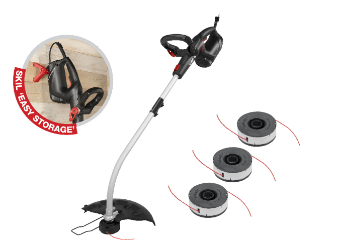 The SKIL 0731 strimmer quickly and efficiently handles heavier jobs such as trimming tall or rough grass and weeds, as well as all regular trimming of lawn edges and borders. With a 1000W motor and a high-quality two-line cutting system, you’re sure to finish your trimming jobs easily. Thanks to SKIL’s exclusive ‘Easy Storage’ design, this strimmer takes up minimal storage space after use. This line trimmer is supplied with three spool systems.
