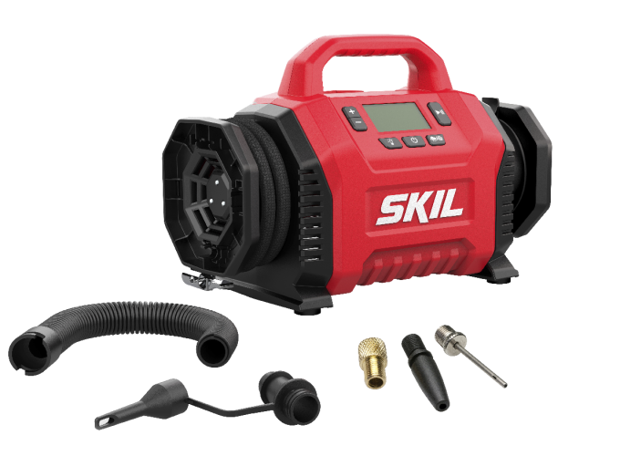 Lo SKIL 3153 è un potente compressore aria a batteria, ideale per gonfiare pneumatici di vetture, pneumatici di biciclette, palloni sportivi, gommoni o materassini ad aria. Lo strumento ha una funzione di alta pressione e di portata elevata. È possibile utilizzare una batteria «PWRCORE 20™» oppure 12 V DC (alimentazione del veicolo). Utilizzando la funzione di alta pressione, il display LCD riporta chiaramente l'indicatore della pressione e le informazioni sulla pressione target. La pressione target può essere impostata con i pulsanti. Lo strumento si spegne in automatico quando viene raggiunta la pressione richiesta. I diversi lavori di gonfiaggio richiedono accessori differenti. Una caratteristica utile di questo compressore aria a batteria è che dispone di un comodo vano integrato per i diversi accessori. Questo permette di avere sempre l'accessorio giusta a portata di mano. Lo SKIL 3153 CA viene fornito con adattatore per valvola Presta, ago per palloni sportivi, adattatore per valvola a manicotto e tubo flessibile dell'aria a portata elevata. La batteria non è inclusa.