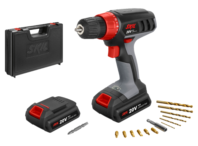 De ‘20V Max’ (18V) SKIL 1008 accuboormachine is alles wat u als doe-het-zelver nodig hebt voor de zwaarste schroefklussen en voor boren in hout en metaal. De 19+1 VariTorque koppelinstelling garandeert precieze resultaten met de 19 instellingen om te schroeven en nog een instelling voor boorklussen. De SKIL 1008 heeft een 10 mm snelspanboorkop voor gemakkelijk wisselen van accessoires. Dit veelzijdige gereedschap heeft werkelijk alles wat u nodig heeft: betrouwbare Lithium-Ion accutechnologie voor een optimale acculevensduur, variabele snelheid en elektronische rem voor volledige controle, en de goede zichtbaarheid van uw werk wordt gewaarborgd door het LED spotlight. Deze accuboormachine wordt geleverd in een stevige draagkoffer met twee accu's, een set van 13 bits om te schroeven en te boren en een magnetische bithouder.