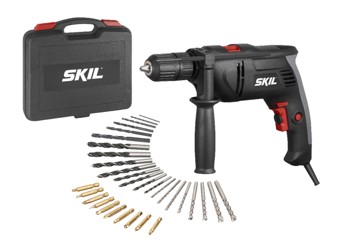 De SKIL 1021 is een krachtige 850W klopboormachine voor alle gangbare boorklussen in en om het huis. Met de hamerfunctie kunt u moeiteloos in metselwerk boren en als u het hamermechanisme uitschakelt, kunt u de SKIL 1021 ook gebruiken voor normaal boren en schroeven. De variabele snelheid met vooraf instelbare snelheid biedt veelzijdigheid en controle voor uw klus voor de beste resultaten. Voor uw gemak kunt u de schakelaar vergrendelen voor continu boren en schroeven. De klopboormachine heeft een snelspanboorkop met vergrendeling die voorkomt dat de boor slipt tijdens de klus. U kunt de zijhandgreep tijdens de klus gebruiken voor een comfortabele bediening met twee handen. Met de diepteaanslag kunt u eenvoudig de boordiepte voor blinde gaten instellen. De SKIL 1021 wordt geleverd in een stevige koffer met 8 steenboren, 8 houtboren, 6 metaalboren en een set van 10 schroefbits.