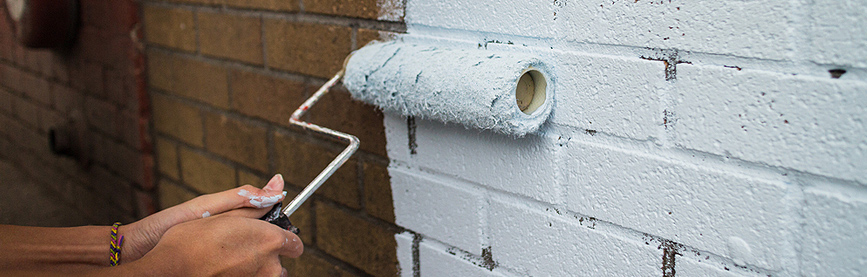 Dek dichtbij staande planten en struiken af met plasticfolie. Plak kozijnen en ander houtwerk af met schilderstape. Schilder met een blokkwast eerst de randen van de muur en de aansluitingen met de kozijnen en goten. Laat de vlakken goed overlappen, schilder van het droge vlak naar de natte verf rand.
