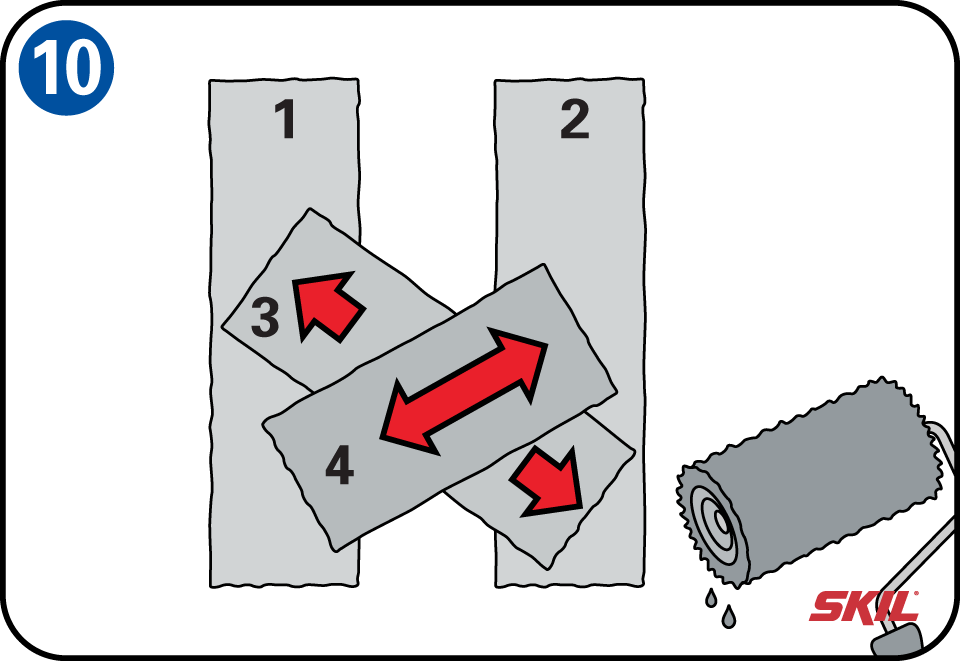 Gebruik vervolgens een langharige rol. Hiermee krijg je minder last van zichtbare overlappingen en het schilderen gaat een stuk sneller. Zorg ervoor dat je rol goed met verf verzadigd is. Breng een verticale strook verf aan. Neem opnieuw verf op de rol en breng op 40cm afstand de tweede strook aan. Rol de twee stroken verf nu kruiselings naar elkaar. Zorg ook dat je verf goed in elke voeg krijgt. Je verft van boven tot halverwege de muur en verf dan vanaf halverwege de muur tot aan de grond. Daarna ga je verder aan de linker- of rechterzijde met de volgende verfbaan. Bij kleinere oppervakken, of dicht bij de kozijnen, gebruik je een smalle verfroller. Let op dat je een natte verf-rand houdt en dat je werkt van droog naar nat.