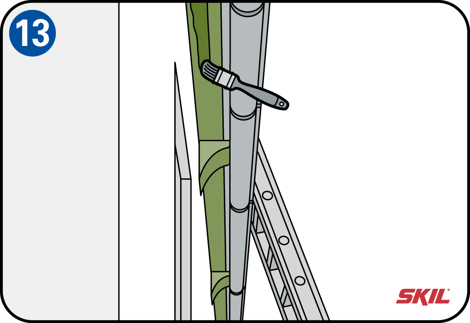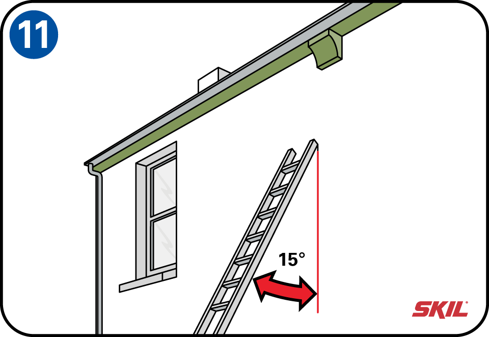 Kies altijd een droge, windstille dag uit. Neem een goede trap of ladder, die ongeveer een meter boven je werkniveau uitsteekt. Zorg dat de ladder op een stabiele ondergrond staat en niet gemakkelijk kan kantelen. Plaats de ladder onder een hoek van ±15° ten opzichte van de muur. Als je tijdens het verven op de ladder, je meer dan een armlengte opzij moet reiken, moet je de ladder verplaatsen.