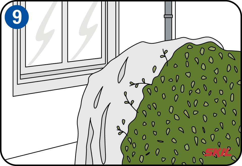 Je moet altijd op een schone muur beginnen. Is de muur watergevoelig of woon je in een bosrijke omgeving, dan heb je ongetwijfeld te maken met mos of groenvorming. Je kunt het groen verwijderen met een staalborstel en een plamuurmes. Nadien strijk je de muur in met verdund bleekwater. Half bleek, half water. Enkele uren laten inwerken en daarna grondig naspoelen met water. De muur moet echt goed droog zijn voordat je met schilderen kan beginnen. Dit zal enkele dagen duren.