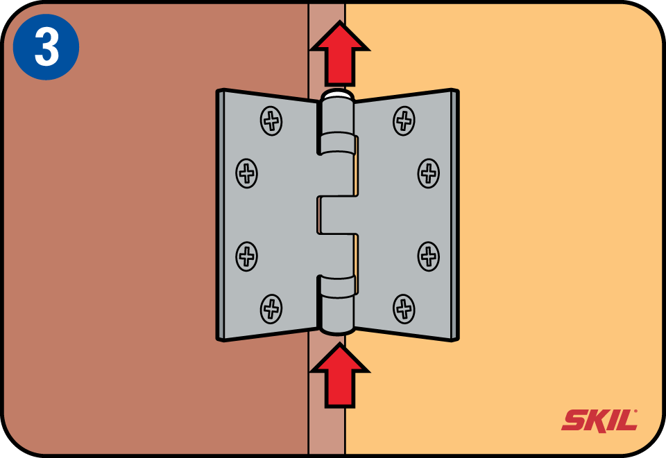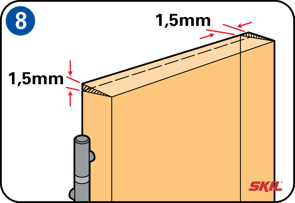 Om de deur in de lengte genoeg bewegingsruimte te geven is 4 tot 8 mm speling voldoende. Geef met een potloodstreepje aan hoeveel er aan de onderkant van de deur moet worden afgehaald. Vervolgens tik je met een hamer en een drevel de scharnierpennen uit de deur. Als je geen drevel hebt, gebruik dan een grote spijker.