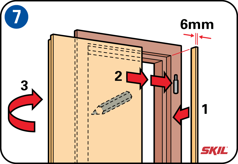 Ga eerst na of de deur aan de scharnierzijde evenwijdig loopt met het kozijn. Als dit niet het geval is moet je die eerst gelijk schaven. Om rekening te houden met de speling die de deur nodig heeft om vrij te draaien van het kozijn, plaats je een latje van 6 mm in het kozijn aan de scharnierzijde. Plaats vervolgens de deur tegen de scharnierzijde. Aan de sluitzijde van de deur kan je de deur nu aftekenen, door langs het kozijn een potloodlijn te trekken.