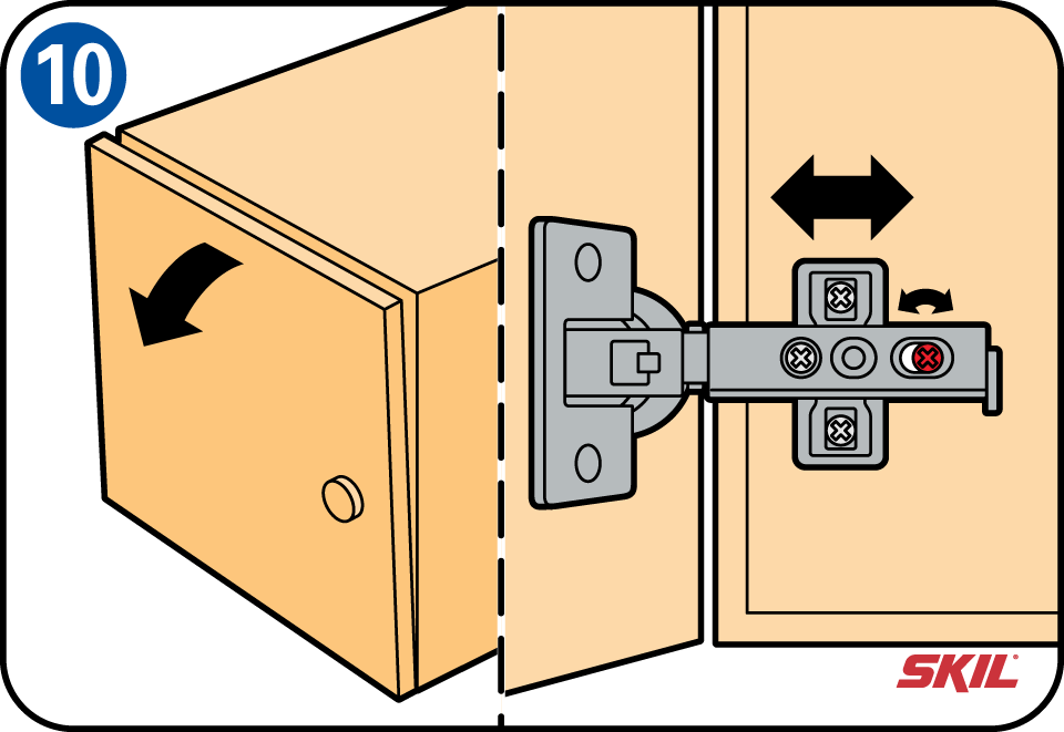 Om de deur vlak tegen het kastframe te laten sluiten, kun je deze afstellen. Draai de schroef los die met de zwarte pijl is aangegeven. Nu kun je het scharnier naar voren of naar achteren schuiven tot de deur mooi aansluit. Draai vervolgens de schroef weer vast.