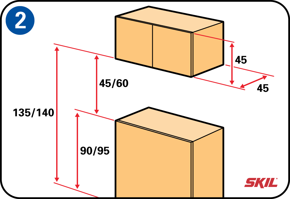 De bovenkasten worden, gemeten vanaf de onderzijde van het keukenkastje, tot ongeveer 135 cm van de vloer geplaatst. Deze afstand laat dan voldoende ruimte over voor eventueel een onderkastje met werkblad en een tussenruimte van 45 tot 60 cm. Plaats je de keukenkast boven een spoelunit, dan moet je een tussenafstand nemen van 90 cm.
