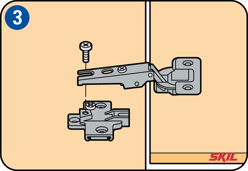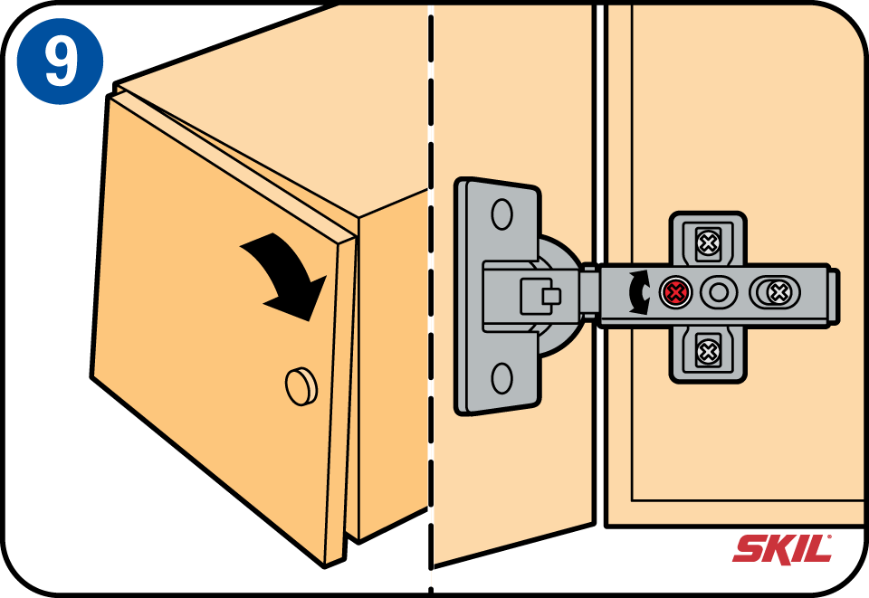 Plaats nu de deurtjes. Je kunt de draairichting van het deurtje zelf bepalen. Vraag je daarbij af wat de meest handige oplossing is als je een keukenkastje in een hoek hebt geplaatst. Ook of je links- of rechtshandig bent kan bepalend zijn. Plaats een scharnierdeel in de zijwand en het andere in het uitgespaarde ronde gat in de deur. Schuif de scharnierdelen in elkaar en schroef ze vast. Het scharnier is in drie richtingen verstelbaar zodat je het deurtje exact recht kunt afhangen.
