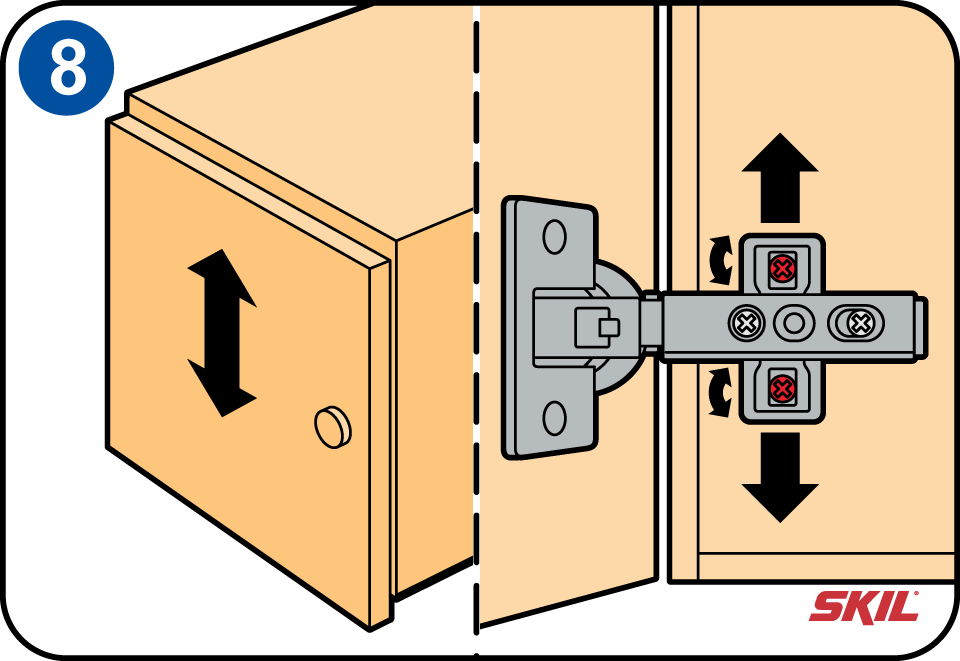 Als de deur schuin hangt, kun je die corrigeren met de met zwarte pijl aangegeven schroef. Bepaal eerst of de deur bij het bovenste of het onderste scharnier moet worden gecorrigeerd.