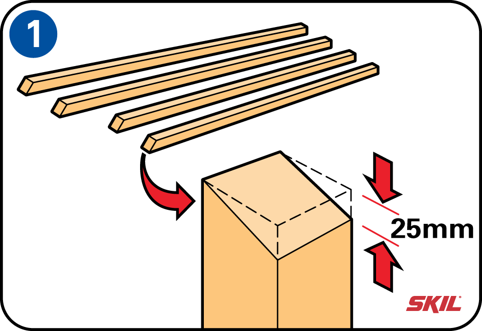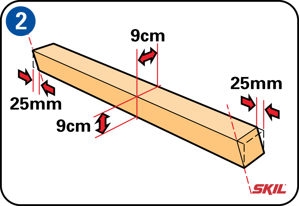 Zaag ook de twee balken voor het dak in een hoek af met een verloop van 25 mm. Let op dat allebei de zijden evenwijdig zijn. Zorg dat deze daklat 30 cm verder uitsteekt dan de basisbreedte in verband met waterafloop van het dak.