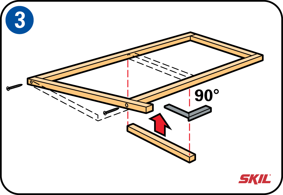 Leg de voorste en de achterste paal op een vlakke ondergrond, met de afgezaagde schuine vlakken evenwijdig naar elkaar. Verbind de palen aan de bovenzijde met de dakbalk op de gewenste breedte met een uitsteek van 30 cm. Boor de gaten voor met een dunne houtboor. Zo voorkom je scheuren in het hout. Draai de schroeven even nog niet te vast en gebruik voorlopig maar 1 schroef per verbinding. Verbind de staanders halverwege met een dwarslat. Draai ook deze schroeven nog niet helemaal vast. Controleer met een winkelhaak of de dwarslat haaks zit en draai dan alle schroeven vast.