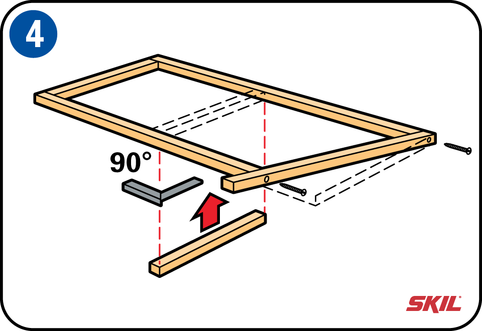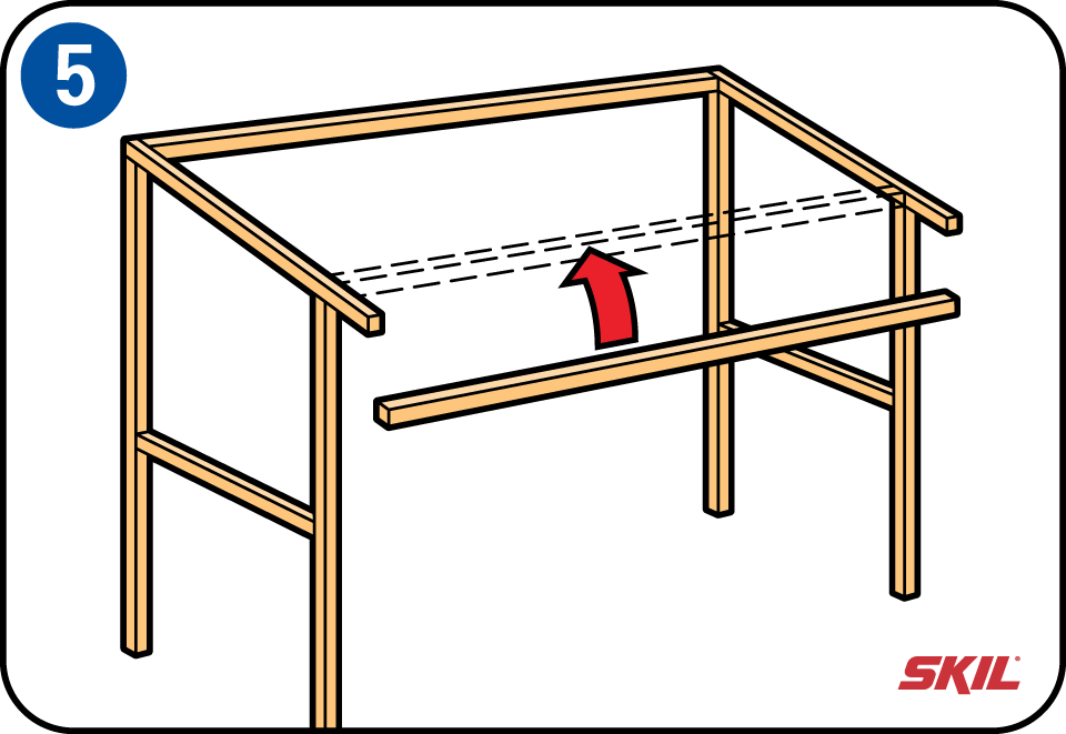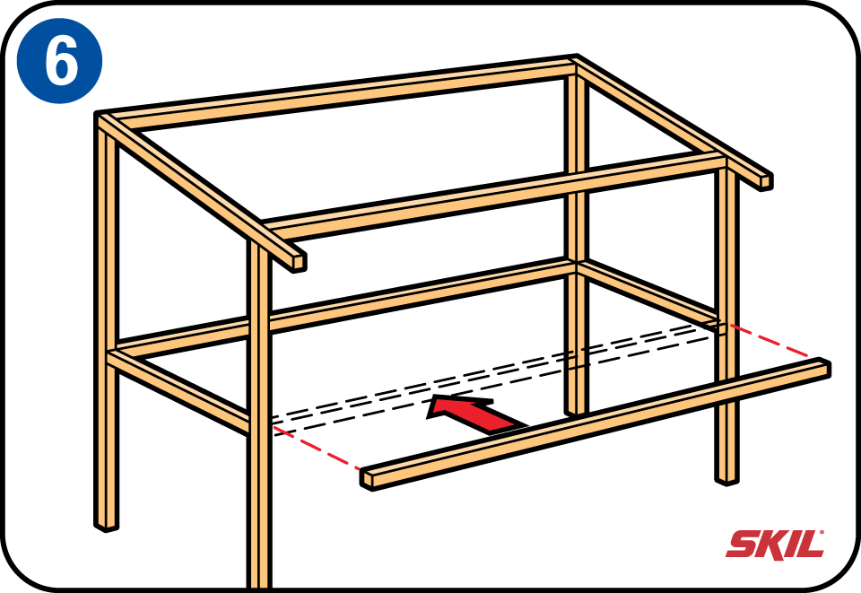 Nu kun je de achterste middelste lengtebalk monteren, gelijk met de dwarslat van de staanders en op dezelfde hoogte. Bevestig de voorste middelste lengtebalken: schroef ze tegen de voorste staanders vast.