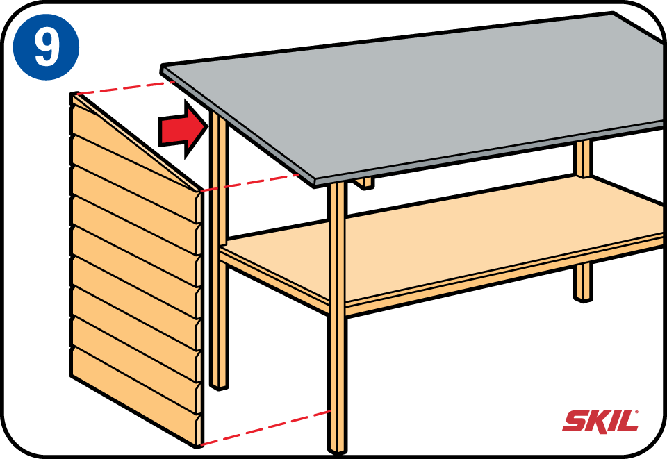 Zet beide zijpanelen van het frame omhoog en verbind de bovenste achterste lengtebalk gelijk met de daklat tegen de staander. Vergeet niet de staander voor te boren. Schroef vervolgens de voorste bovenste lengtebalk aan beide zijpanelen vast.