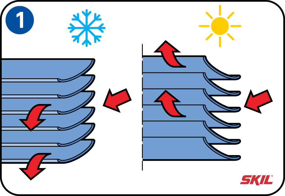 Dit type zonwering heeft een uitstekende isolerende werking. In de winter stroomt de warme luchtstroom de ruimte in. De holle zijde van de lamellen zijn dan naar binnengericht. In de zomer wordt de warme luchtstroom naar boven afgevoerd. De holle zijde van de lamellen zijn dan naar buitengericht. Deze jaloezieën hebben een bovenbalk met een trek- en kantelmechanisme.