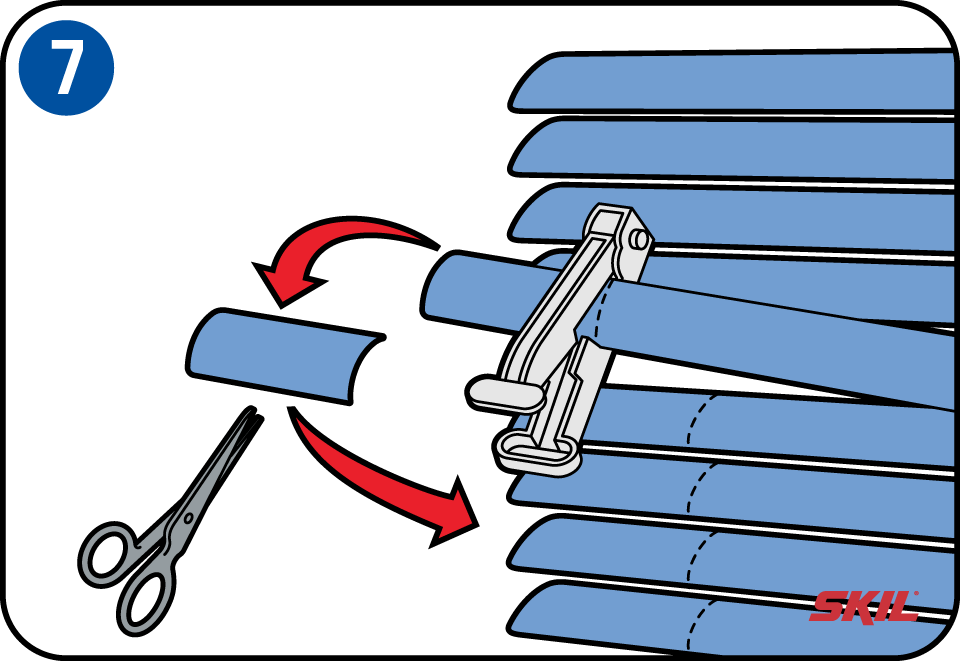 Hang de jaloezie voor het inkorten tijdelijk op en teken de binnenmaat op de onderste lamel af. Verdeel deze binnenmaat gelijkmatig over de linker- en rechterkant. Knip met een speciale lamellenknipper of een schaar de lamel op maat. Knip daarna de andere lamellen op maat (gebruik het overgebleven stukje lamel als maat voor de rest). Daarna kun je de jaloezie ophangen en de steunen sluiten.