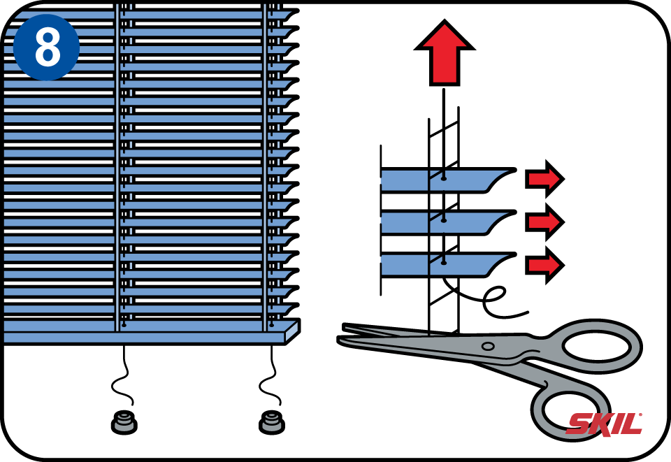 Als de jaloezie te hoog is, dan is het lamellenpakket aan de onderzijde te dik. Je kunt de overtollige lamellen verwijderen. Haal de kunststof dopjes uit de onderbalk en knoop het koord aan de onderzijde los. Verwijder de onderbalk en haal de overtollige lamellen uit het ladderkoord. Daarna kun je de onderbalk weer terugplaatsen en het koord doorvoeren. De kunststof doppen kunnen weer terug op de balk en het ladderkoord kan op maat worden afgeknipt en vastgeknoopt. Als laatste bevestig je de draaistok in de houder.
