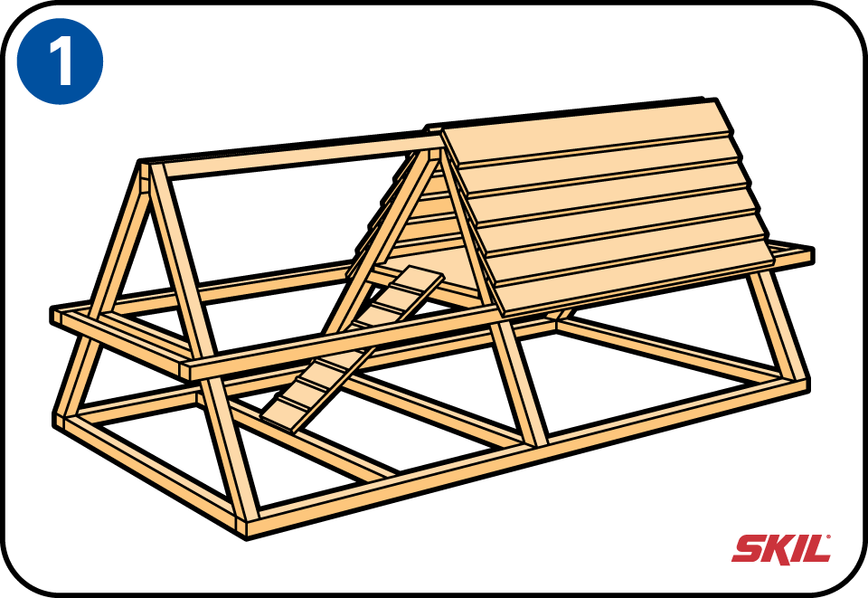 Bouw het frame van het kippenhok door de drie A-frames te monteren met de nokbalk. Zorg ervoor dat de driehoeken netjes uitgelijnd zijn. Controleer met een waterpas of de A-frames recht staan voordat je de nokbalk vastschroeft.