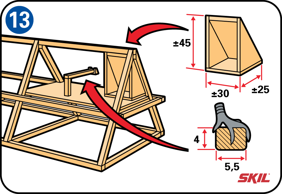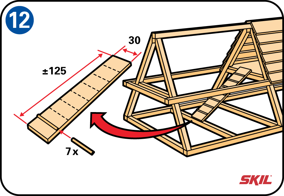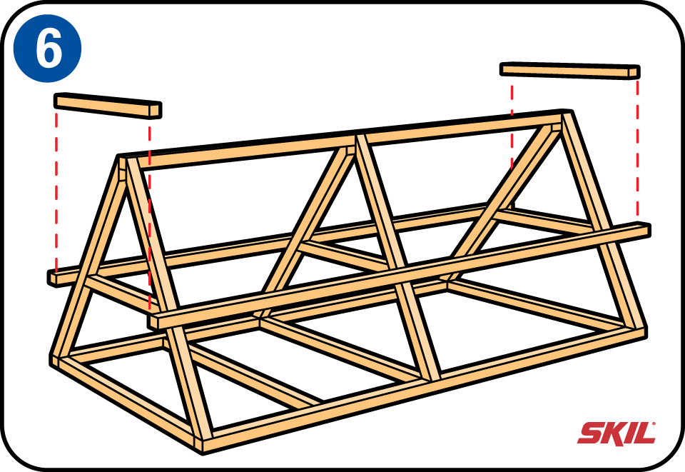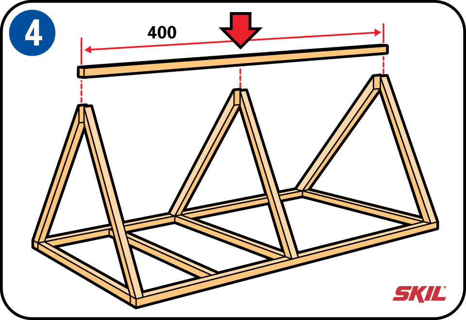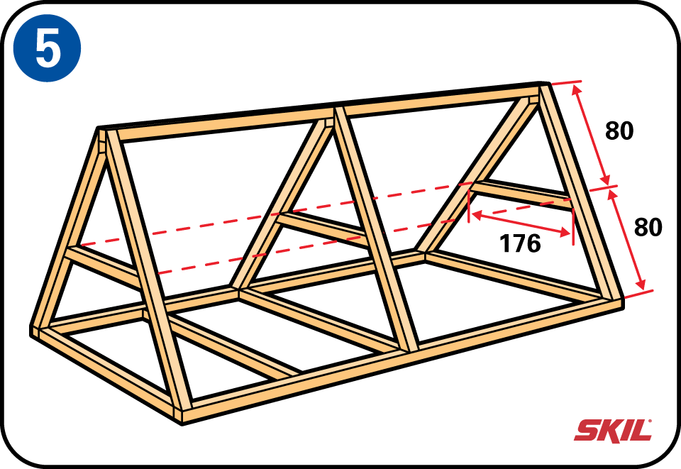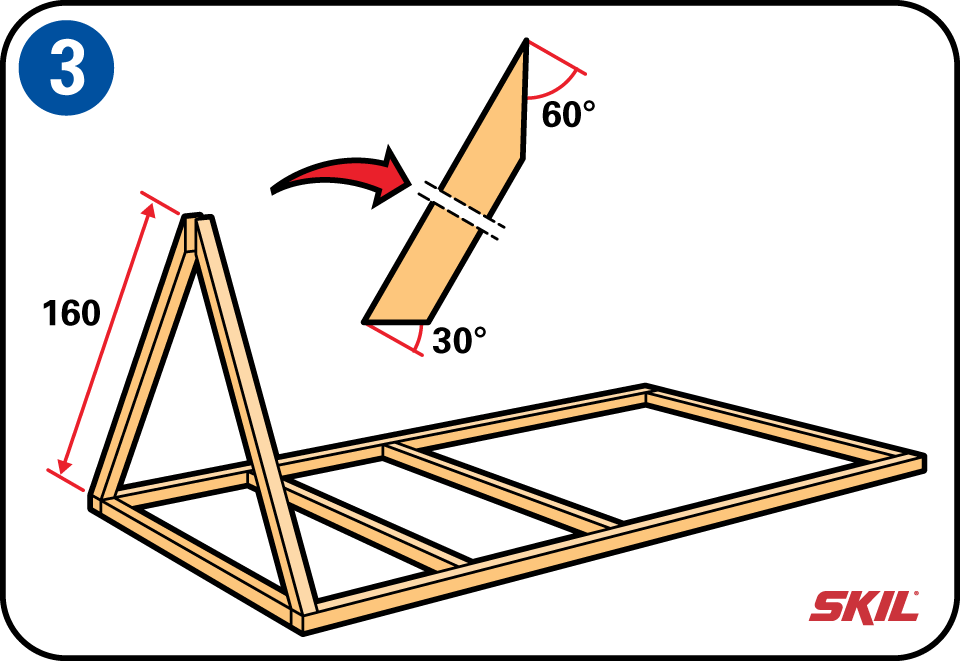De A-steunen worden gevormd door een driehoek. De onderzijde van de driehoek zaag je in een hoek van 60°. De bovenzijde van de driehoek zaag je in een hoek van 30°. Daarna zet je de onderste hoeken van de balkjes vast met gegalvaniseerde schroeven van ongeveer 65 mm.