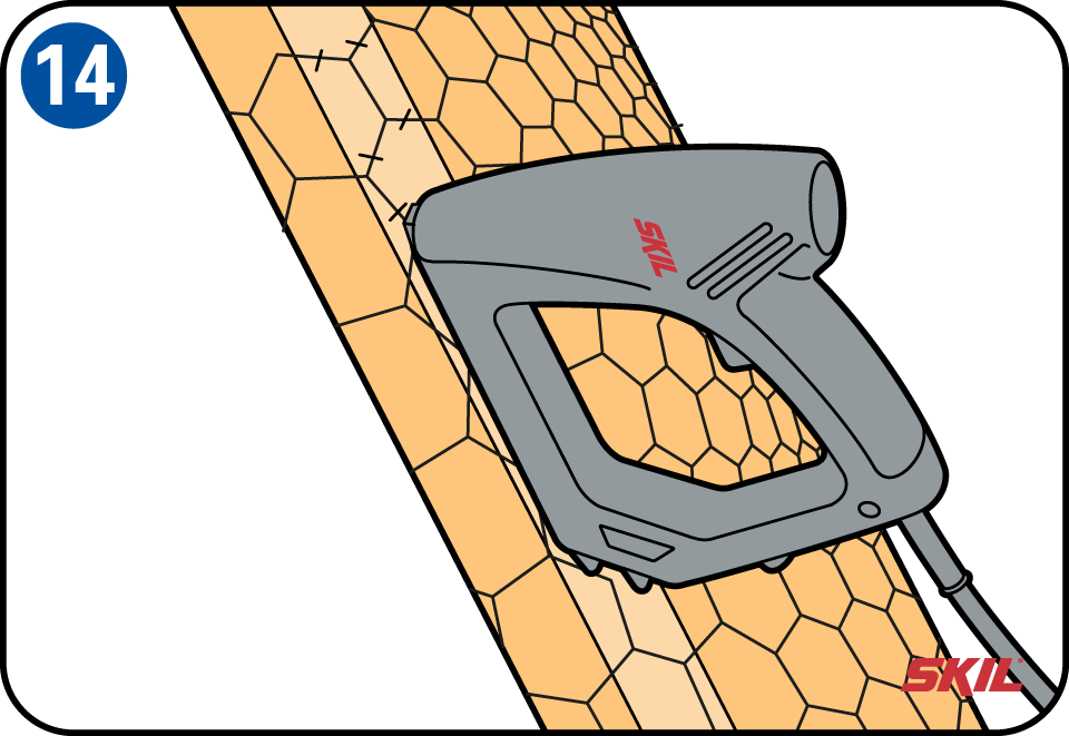 Bevestig het kippengaas op de kippenren en zet dit vast met nietjes of krammetjes. Breng hierover afwerklatjes aan om je niet te bezeren aan het gaas. Je kunt het gaas ook aanbrengen voordat je de draagbalken plaatst, maar dan is het moeilijker om het trapje te plaatsen.