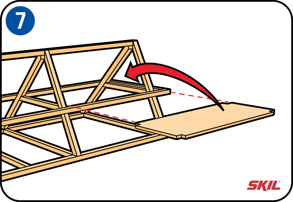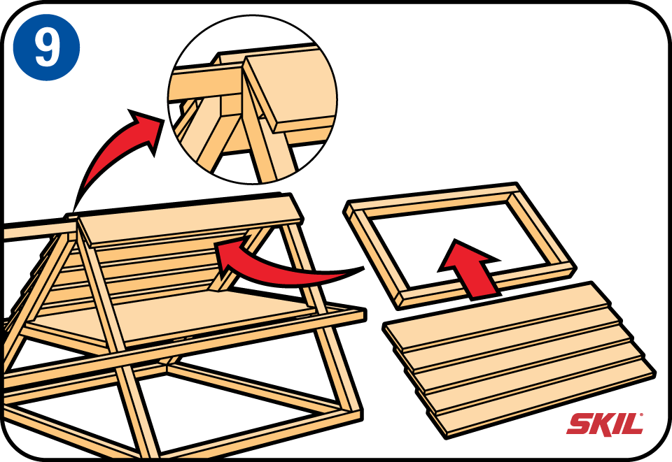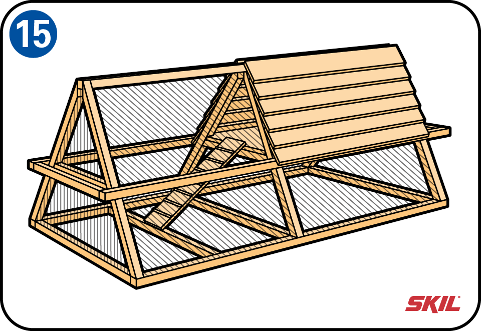 De voorzijde van het dak van het nachthok wordt gebruikt als toegang. Schroef eerst een plank aan de bovenzijde vast. Onder deze plank plaats je een afstandsblokje om het dakpaneel eronder te kunnen schuiven. Hierdoor blijft het paneel vastzitten en dit voorkomt inregenen. Voor het losse dakpaneel maak je een frame van balkjes van 75x20 cm. Hierop schroef je dakpansgewijs de horizontale planken vast. Je kunt het dak eventueel aan de onderzijde vastzetten met een draaibaar houten blokje of een koffergrendel.