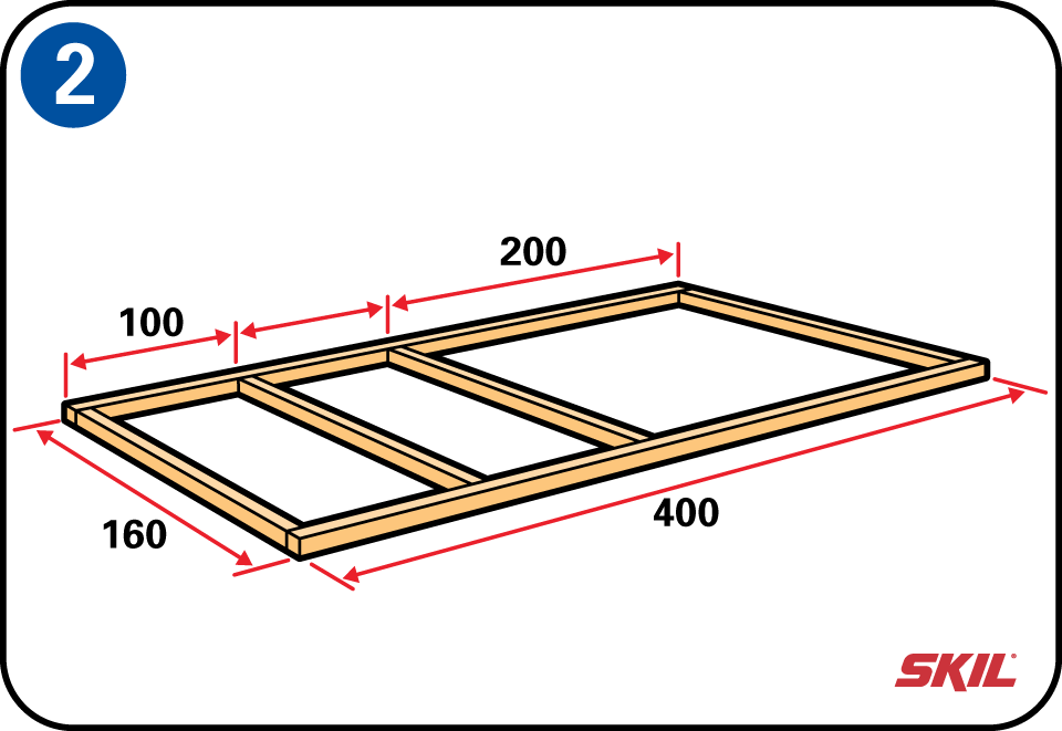 De eerste stap is het samenstellen van het frame van de kippenren. Je maakt het frame volgens tekening van balken van 44x44 mm. Om te voorkomen dat het hout splijt bij het vastschroeven kun je het beste alle gaten eerst voorboren.