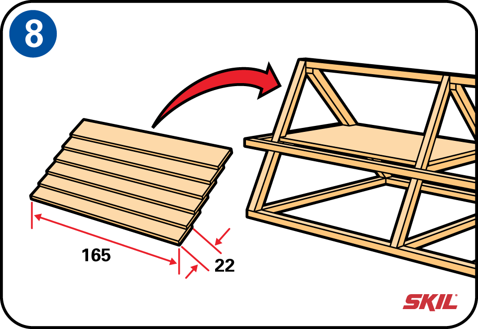 Daarna volgt het achterste dak van het nachthok. Hiervoor gebruik je dakpansgewijs geplaatste plankjes van 165x22 mm.