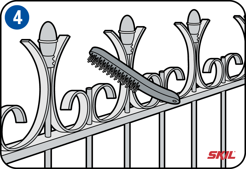 Roest en oxidatie, meestal bij de lassen, kan je gemakkelijk verwijderen met een staalborstel met de hand of op een boormachine gemonteerd. Een alternatief bij vlakke hekken is de verfstripper met reinigingsschijf. Gebruik stofmasker en veiligheidsbril en handschoenen. Verwijder alle roestdelen, anders komt het onherroepelijk terug. Roestvorming begint meestal aan de randen en opgelaste elementen, daar moet je dan ook de meeste aandacht aan besteden en is vaak lastig te bewerken.