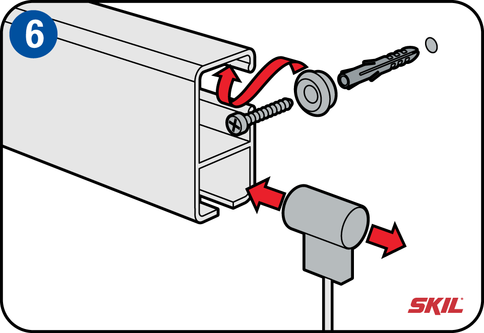De bevestigingsclips monteer je om de 40 cm door middel van pluggen en schroeven aan de wand. Daarna klik je het profiel op de clips. Het draad schuif je in de rail. De eindkappen zorgen voor de afwerking. De ophanghaak is in hoogte verstelbaar.