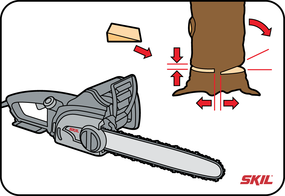 Het kan voorkomen dat de zaag vastloopt, doordat het zware gewicht van de boom op de zaagsnede rust. Sla in dat geval een wig in de zaagsnede zodat de zaag weer vrij kan bewegen.