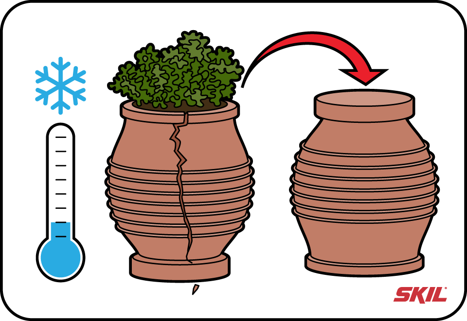 Aardewerk is gevoelig voor vorst en kan barsten wanneer je hier geen rekening mee houdt. Zet je bloempot, vaas, asbak en ander aardewerk ondersteboven op een beschutte plaats. Zo kan er geen water in blijven staan en breekt je aardewerk niet bij vorst.