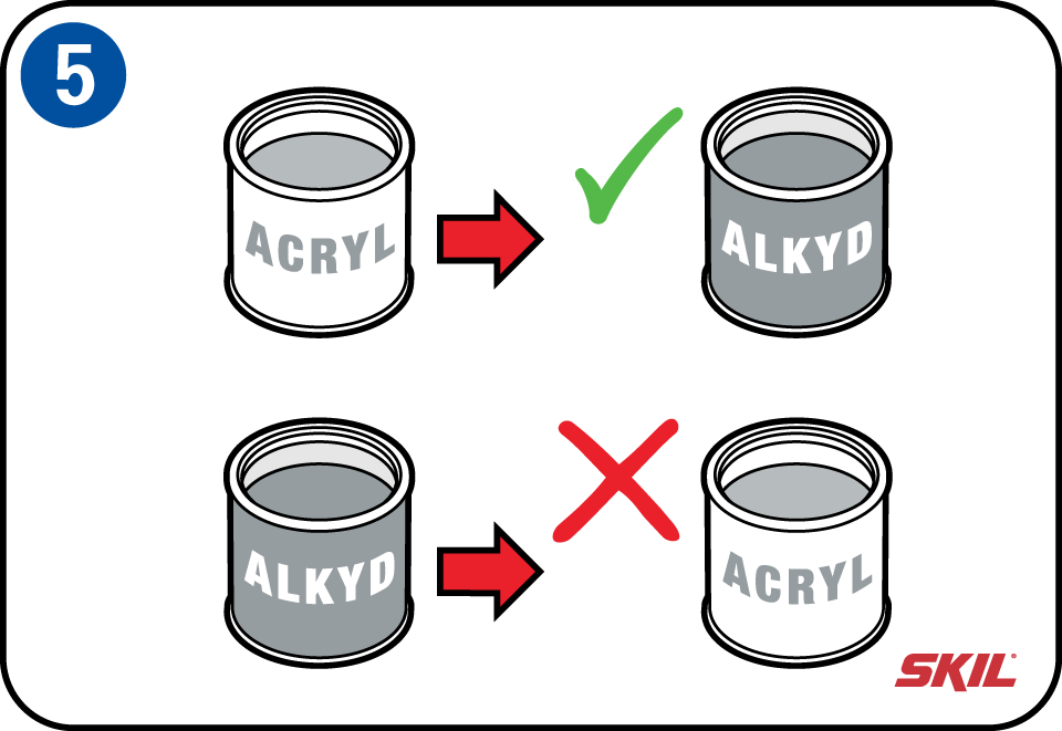 Acrylverf kan je wel, nadat je goed hebt geschuurd, aanbrengen over alkydverf. Maar niet andersom! Als je acrylverf hebt gebruikt, moet je dus altijd acrylverf blijven gebruiken. Wil je terug naar een terpentine-verdunbare alkydverf, dan zal je de hele acryllaag moeten verwijderen. Meestal moet je deze laag afsteken of afbranden, in het ergste geval moet je afbijt gebruiken.