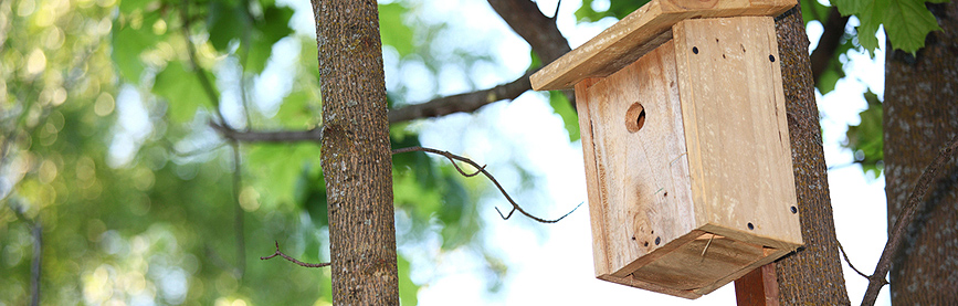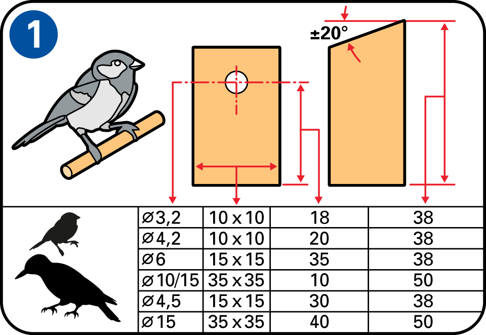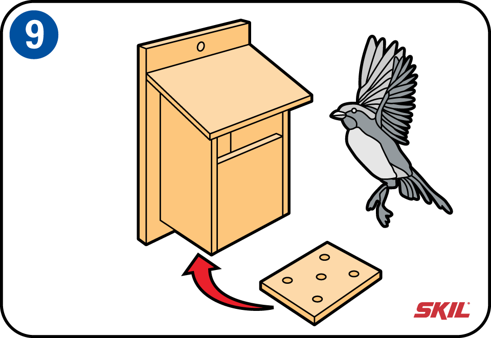 Aan de onderzijde van het vogelhuisje boor je een aantal 10 mm gaatjes voor de afvoer van regenwater. Als alternatief voor een ronde vliegopening kun je ook een lagere voorzijde plaatsen. Dit heeft als voordeel dat het vogelhuisje voor verschillende vogels toegankelijk is.