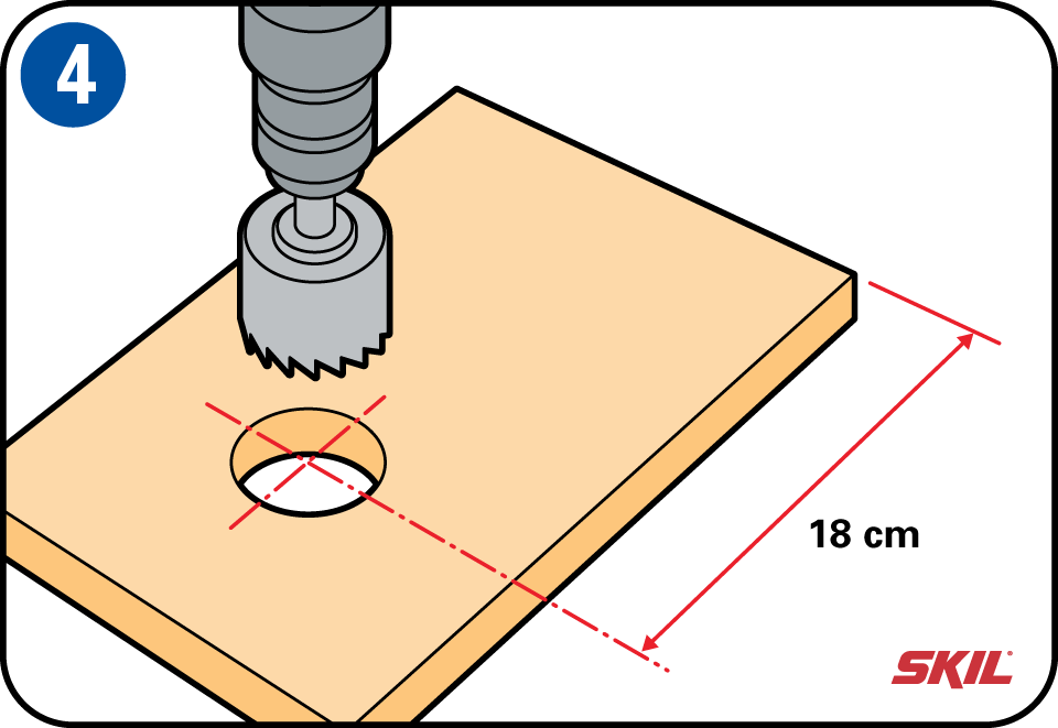 Boor de invliegopening 18 cm vanaf de onderzijde van het voorzijde plankje met een 32 mm boor. Om te voorkomen dat het hout gaat splinteren, leg je het plankje op een plaatje afvalhout. Boor door het plankje en tevens een klein stukje in het afvalhout. Dit geeft een mooi glad resultaat.