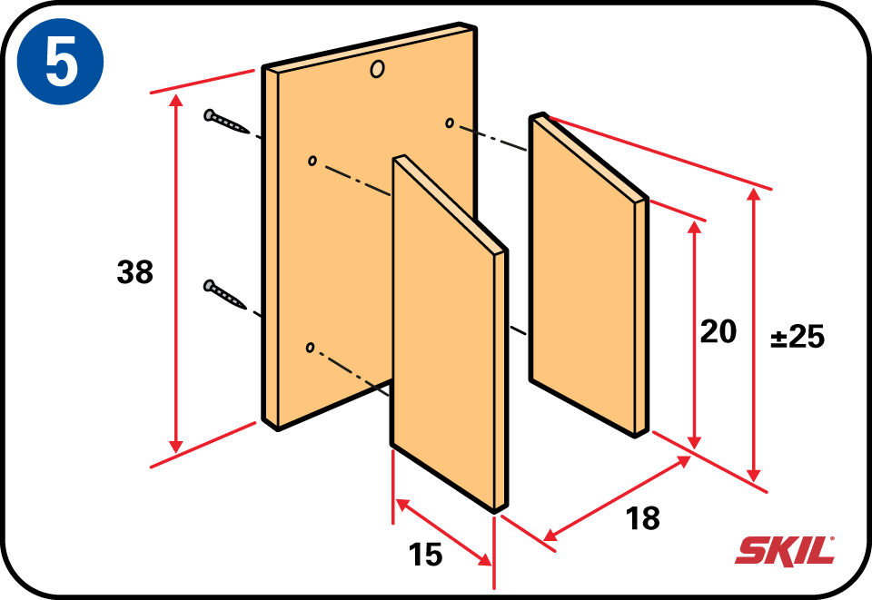 Monteer de zijpanelen op de achterwand met waterbestendige houtlijm en spijkers of schroeven. Zorg dat je eerst voorboort om te voorkomen dat het hout gaat splijten. Tevens boor je boven en onder de ophanggaten voor bevestiging.