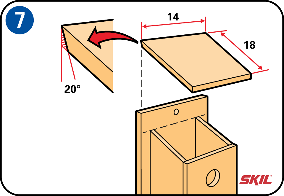Zaag, schaaf of vijl het achterste gedeelte van het dakje onder een hoek van 20°. Hierdoor sluit het dakje beter aan op de achterwand.