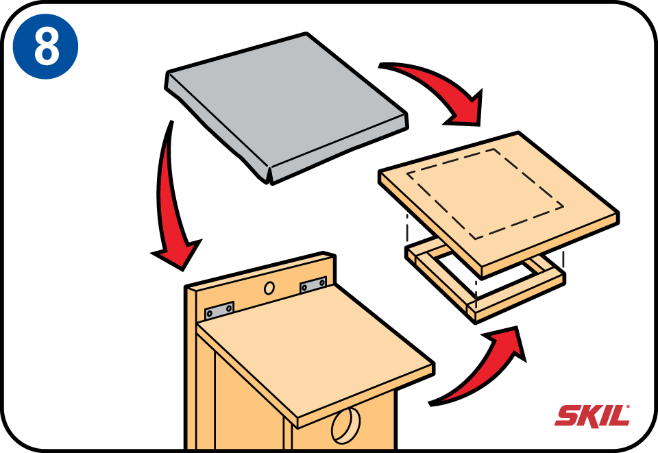 Je kunt ervoor kiezen om scharniertjes aan de achterzijde van het dak te monteren. Je kunt ook aan de onderzijde van het dak extra plankjes aanbrengen. De afmetingen hiervan zijn 5 mm minder dan de binnenmaten van de wanden en voorzijde, zodat het dak min of meer vastligt. Vervolgens dien je het dak van het vogelhuisje te voorzien van een stukje dakleer of een velletje lood.