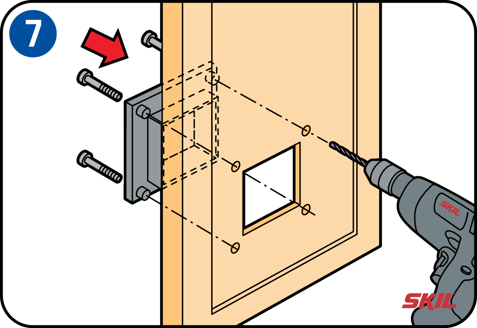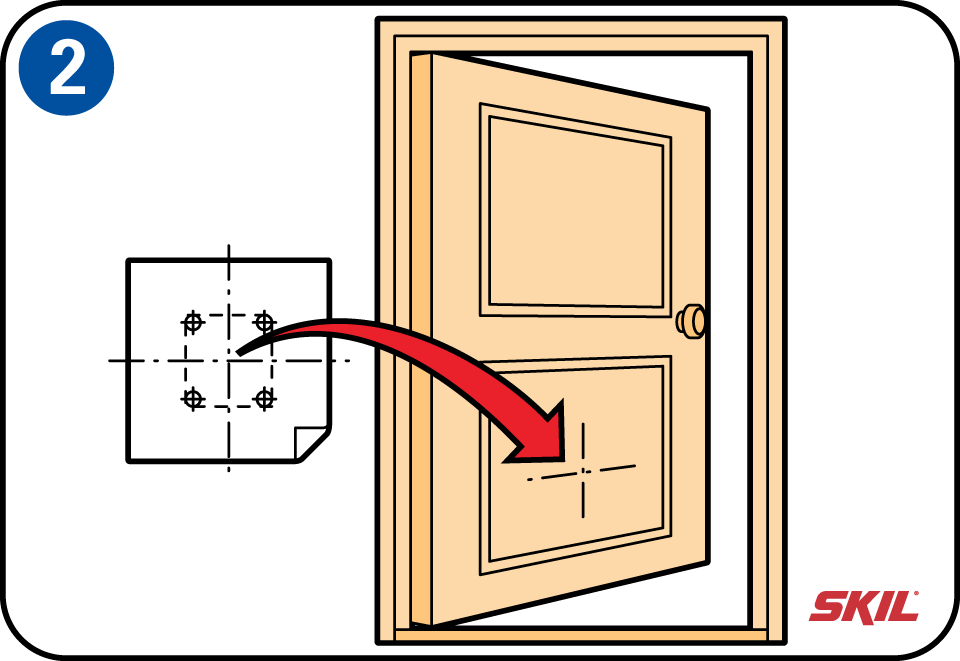 Boor met de aangegeven diameter op elk van de vier potloodstrepen het schroefgat tot aan de andere kant van de deur. Houd hierbij de boormachine nauwkeurig horizontaal.