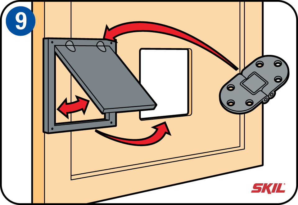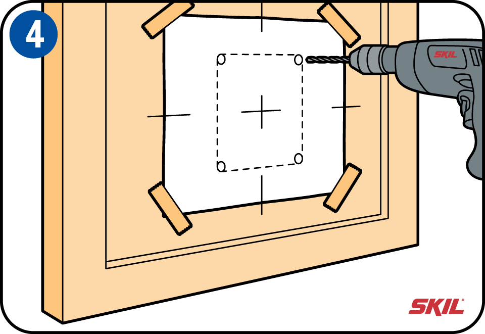 Als de voorzijde van het luik recht in de deur is geplaatst, kan je de schroefgaten aftekenen in de vier hoeken.
