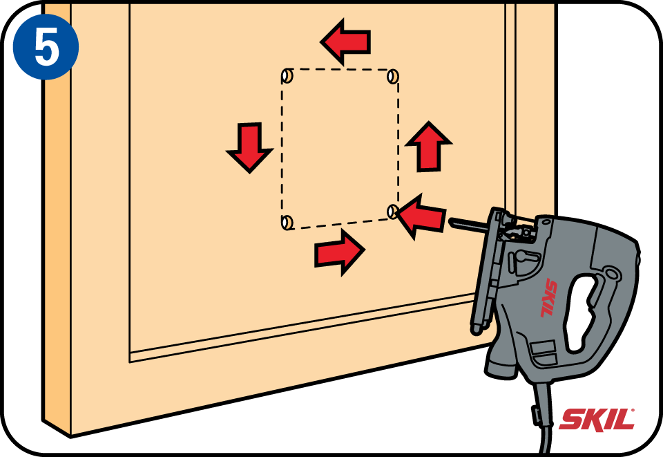 Voordat je gaat zagen, controleer je eerst of de deur gesloten is. Neem een stabiele positie in en plaats de decoupeerzaag vlak in het gat. Houd de zaag goed vlak tegen de deur en zorg dat hij niet gaat pendelen. Zaag niet gehaast en volg nauwkeurig de lijnen. Zaag zo recht mogelijk van boorgat naar boorgat.