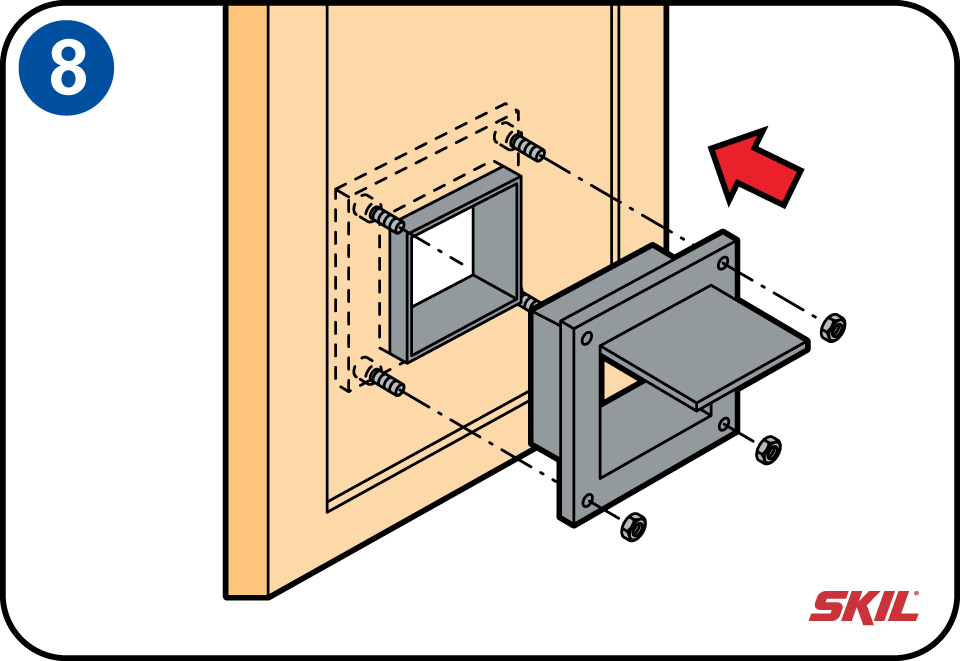 Met de moer in je ene hand en de schroevendraaier in je andere hand zet je het kattenluikje losjes vast. Herhaal dit met de andere drie schroeven. Als ze alle vier handvast zitten controleer je of het kattenluikje mooi recht zit. Draai dan pas alle schroeven goed vast.
