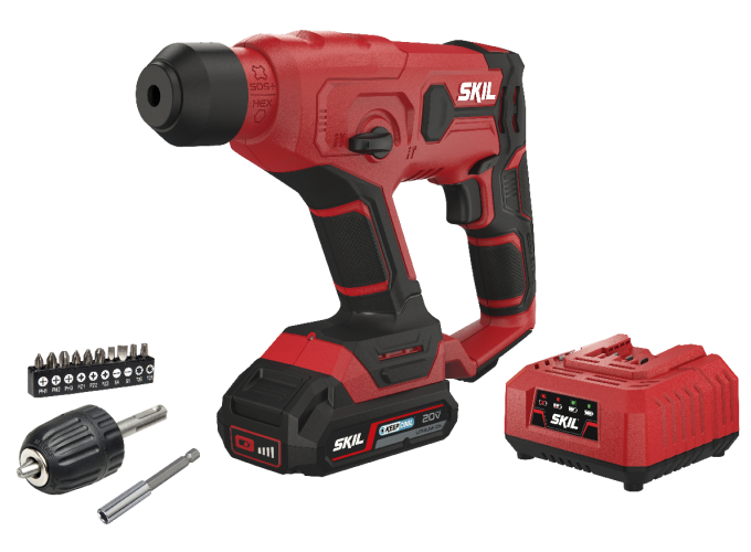 O SKIL 3810 «20V Max» (18 V) é um martelo rotativo 3 em 1 compacto mas potente para perfuração em betão, assim como para trabalhos normais de perfuração e aparafusamento. Utilize o mecanismo de martelo para perfurar em betão e desligue o mecanismo para uma perfuração e um aparafusamento regulares. Este martelo rotativo sem fio é compatível com brocas «SDS+» e com brocas sextavadas e pontas de aparafusamento normais. Resumidamente, esta ferramenta versátil oferece verdadeiramente tudo o que precisa: tecnologia fiável de bateria de iões de lítio, velocidade variável para controlo total e a luz LED assegura a boa visibilidade do seu trabalho. Além disso, esta ferramenta dispõe de um prático indicador LED para a frente/para trás, para que possa verificar imediatamente o sentido de acionamento. O indicador do nível de carga da bateria patenteado exibe comodamente o nível de carga da bateria. Por último, o design ergonómico e Softgrip na ferramenta proporcionam um conforto de trabalho extra. O SKIL 3810 AA é fornecido com uma bateria «20V Max» (18 V) 2,5 Ah «Keep Cool», um carregador rápido, um jogo de 10 pontas de aparafusamento, porta-pontas magnético de 75 mm e uma bucha de aperto rápido com adaptador «SDS+».