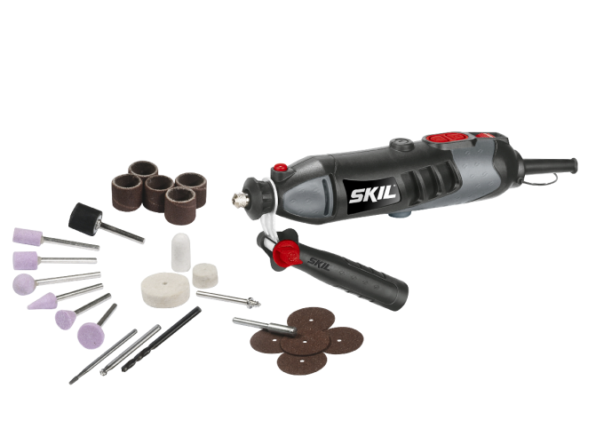 The ergonomic design and adjustable side handle of the rotary tool provide optimum accuracy and working convenience during the job. The SKIL 1415 has a sealed on/off button that protects the tool against dust and debris. This rotary tool is supplied with 25 accessories for cutting, grinding, sanding, polishing and drilling.